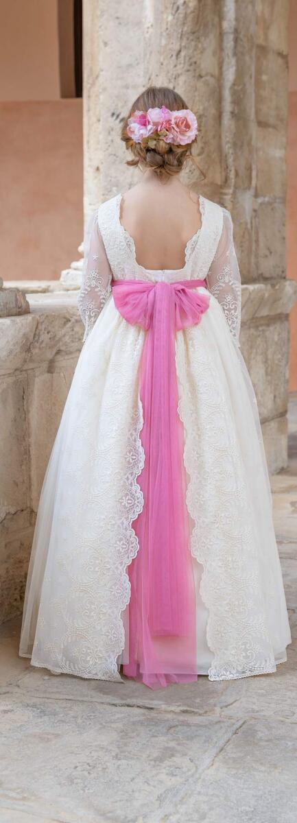 Confeccionado con un tul con topo rosa bordado, un tejido muy dulce. El cuerpo y mangas lleva una delicada puntilla en tonos rosas y marfil. En la cintura como siempre un tocado hecho a mano con unos toques verdes para darle un toque especial a este vestido sencillo, que hará sentirse a tu niña como una verdadera princesa en su día especial.