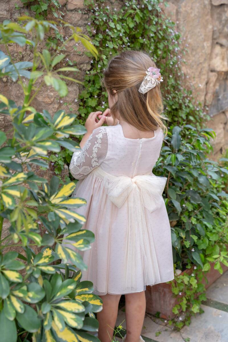 El modelo Laura de comunión está confeccionado con tul en tono maquillaje con bordado al tono. Un color realmente precioso, distinto y muy favorecedor. Hemos optado por un tocado en la espalda para no quitar protagonismo al cuerpo.