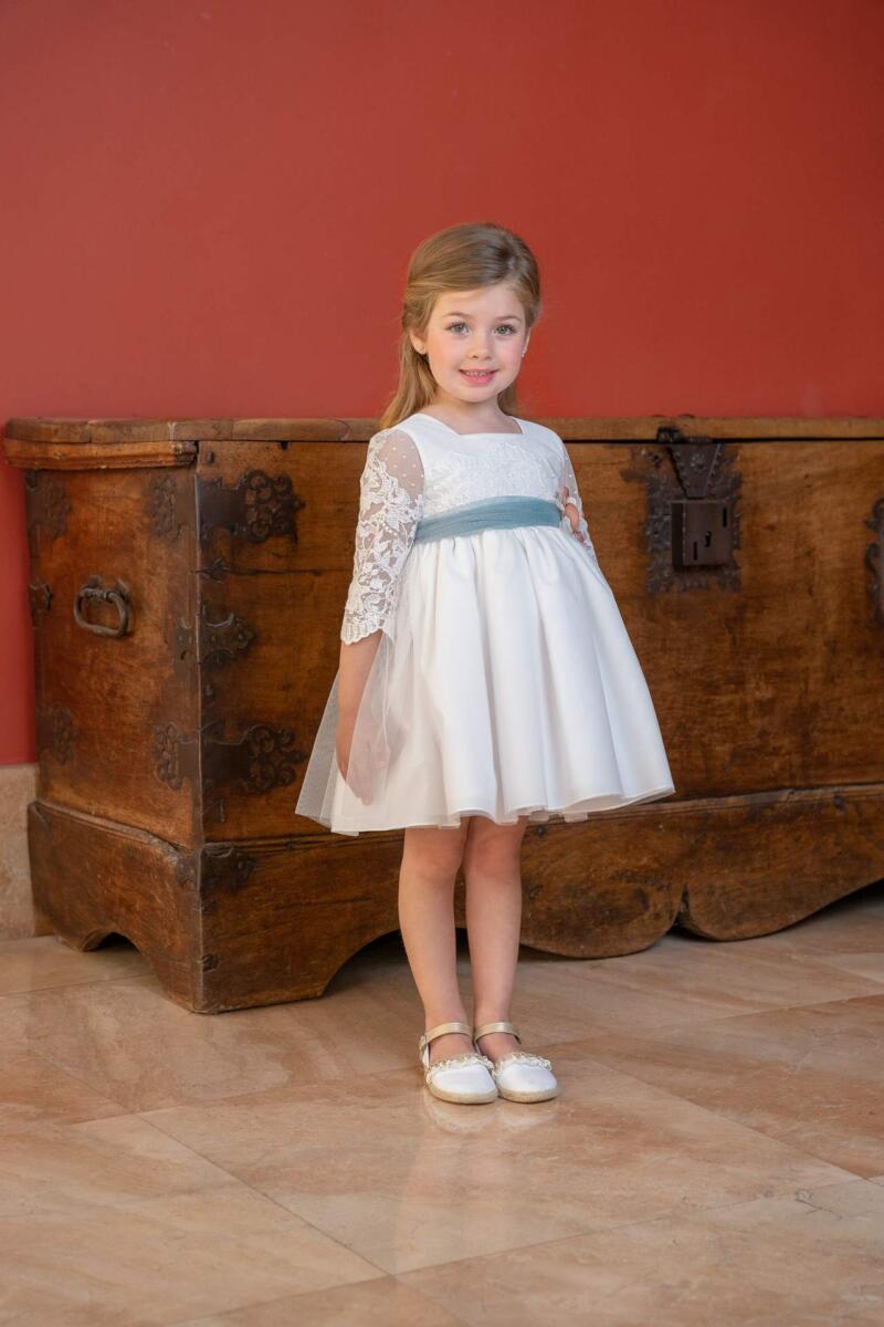 El modelo Lina de comunión tiene un precioso cuerpo muy trabajado, con volantes de puntilla en azul empolvado que cubre toda la espalda. La falda es de tul marfil con bordados floral. Es sin duda nuestro favorito de este año.