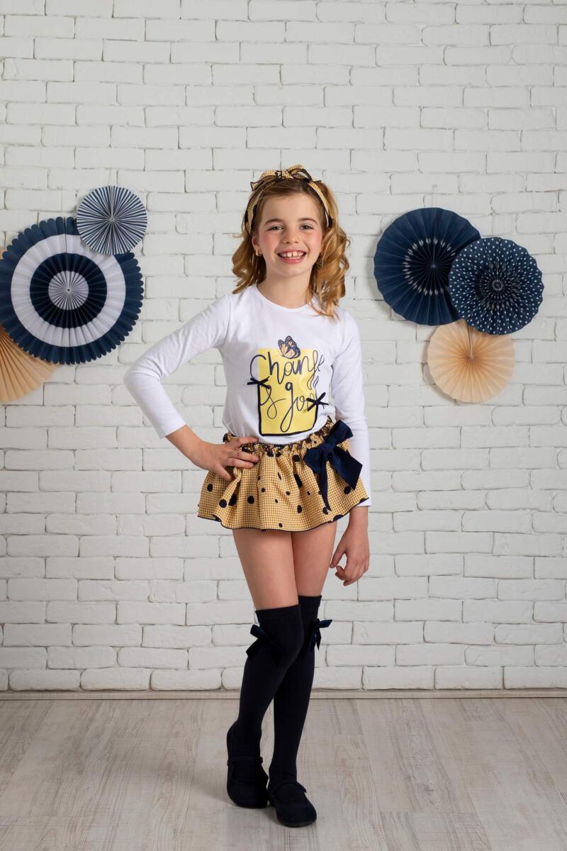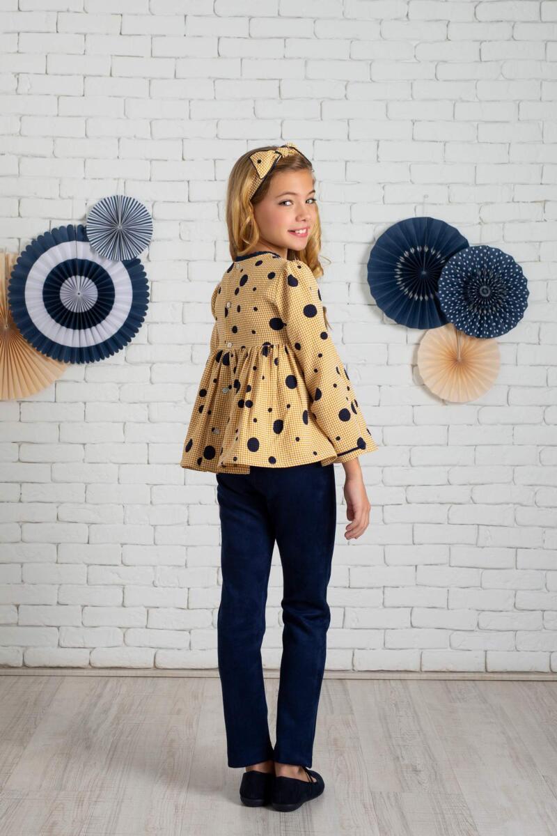 Confeccionada en tejido bambula de cuadros bichi amarillos y blanco con topitos en azul marino.
