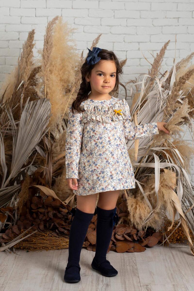 Confeccionada en popelin tramado con un estampado de flores. La pechera lleva una cenefa en punto Smock